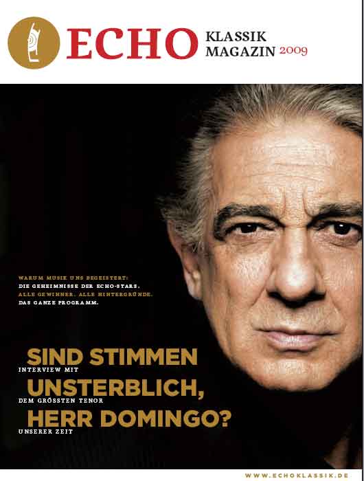 Der ECHO-Klassik ist der begehrteste Preis der Musikbranche. Dieses Jahr wurden u.a. Palcido Domingo und Elina Garanca ausgezeichnet. operatext.com hat gemeinsam mit der Phono-Akademie, Kruger Media und schech.net das ECHO-Klassik-Magazin produzieren - eine aufwändig gestaltete Zeitschrift mit Hintergründen, Storys, Interviews und Berichten rund um die Preisverleihung. Es erschien Anfang Oktober im Handel und sorgte - wie man sieht - beim Echo für prominente Unterhaltung. Hier zum Durchblättern.